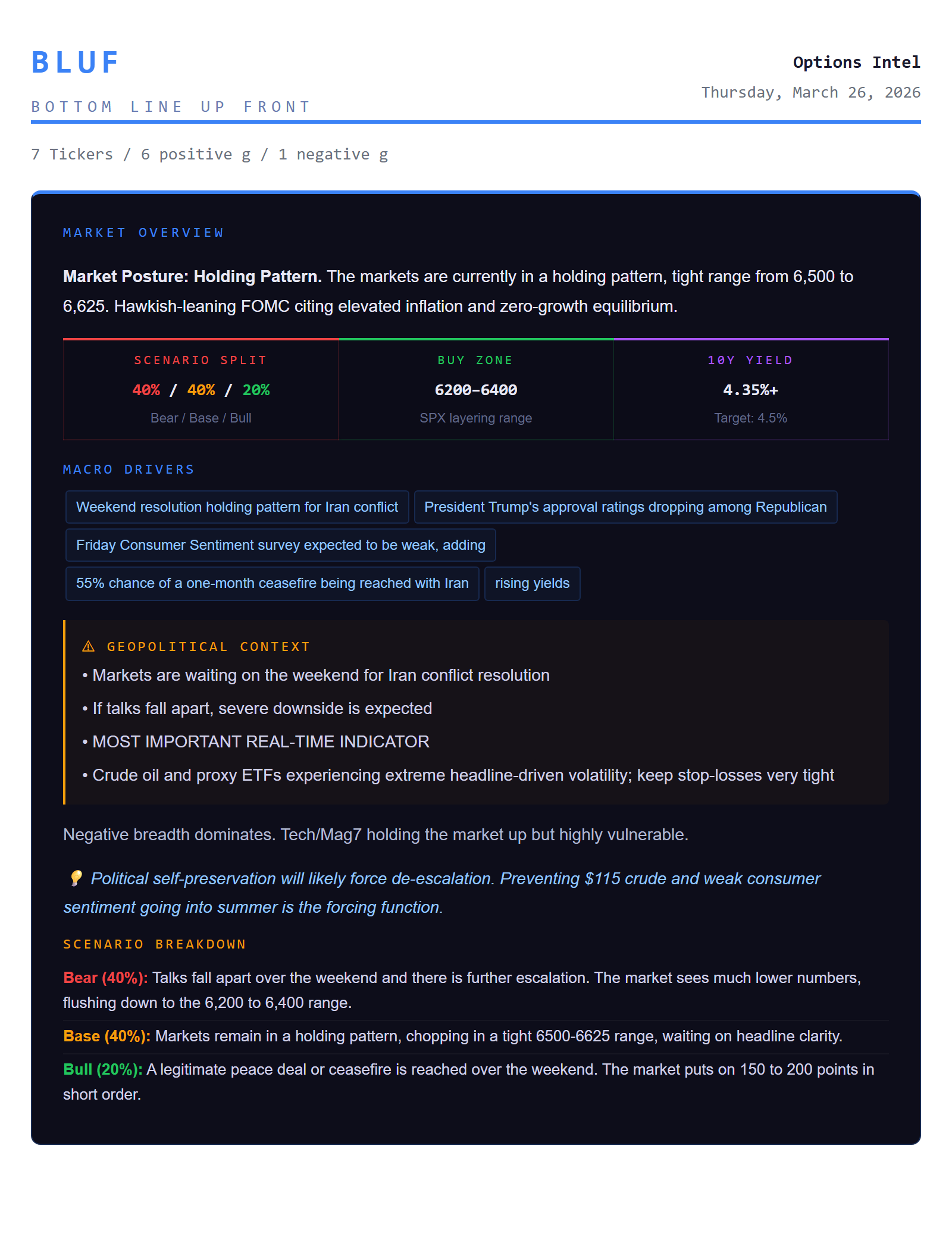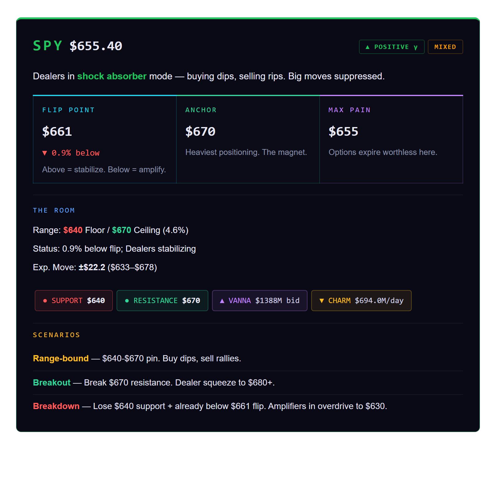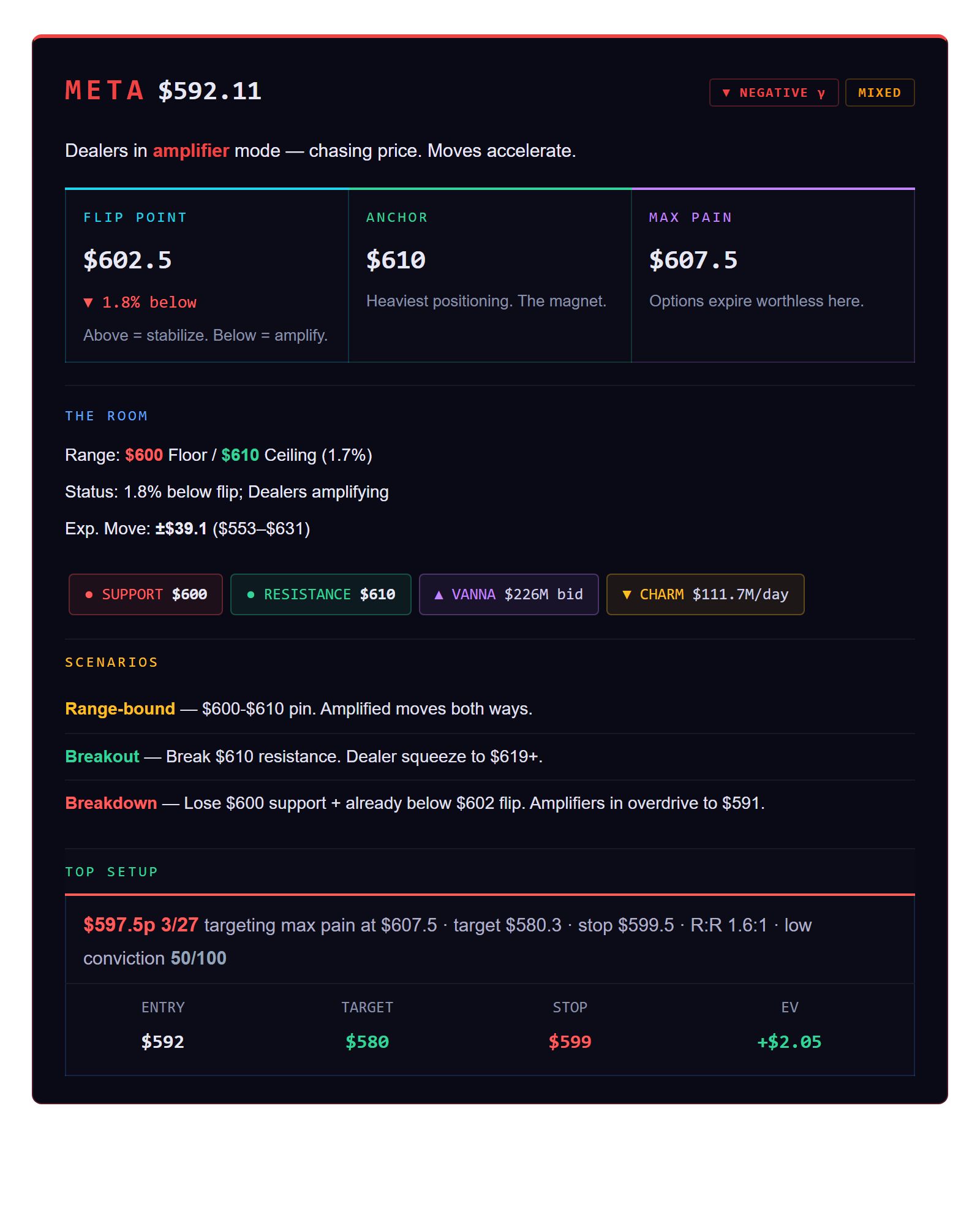 Why it matters: It dictates the "stickiness" or volatility of a stock. When GEX is highly positive, dealers are in "shock absorber" mode—buying the dips and selling the rips, which suppresses big moves and stabilizes the price. When GEX flips negative, dealers do the opposite, amplifying momentum and making wild swings much more likely.